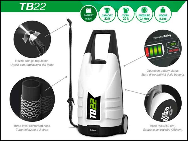 Аккумуляторный опрыскиватель TB22 : высокая емкость, исключительная мобильность и эффективное применение. Он предназначен для больниц уход за газонами, теплицами, садами и другими районами средней протяженности.