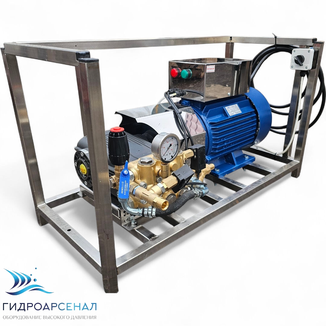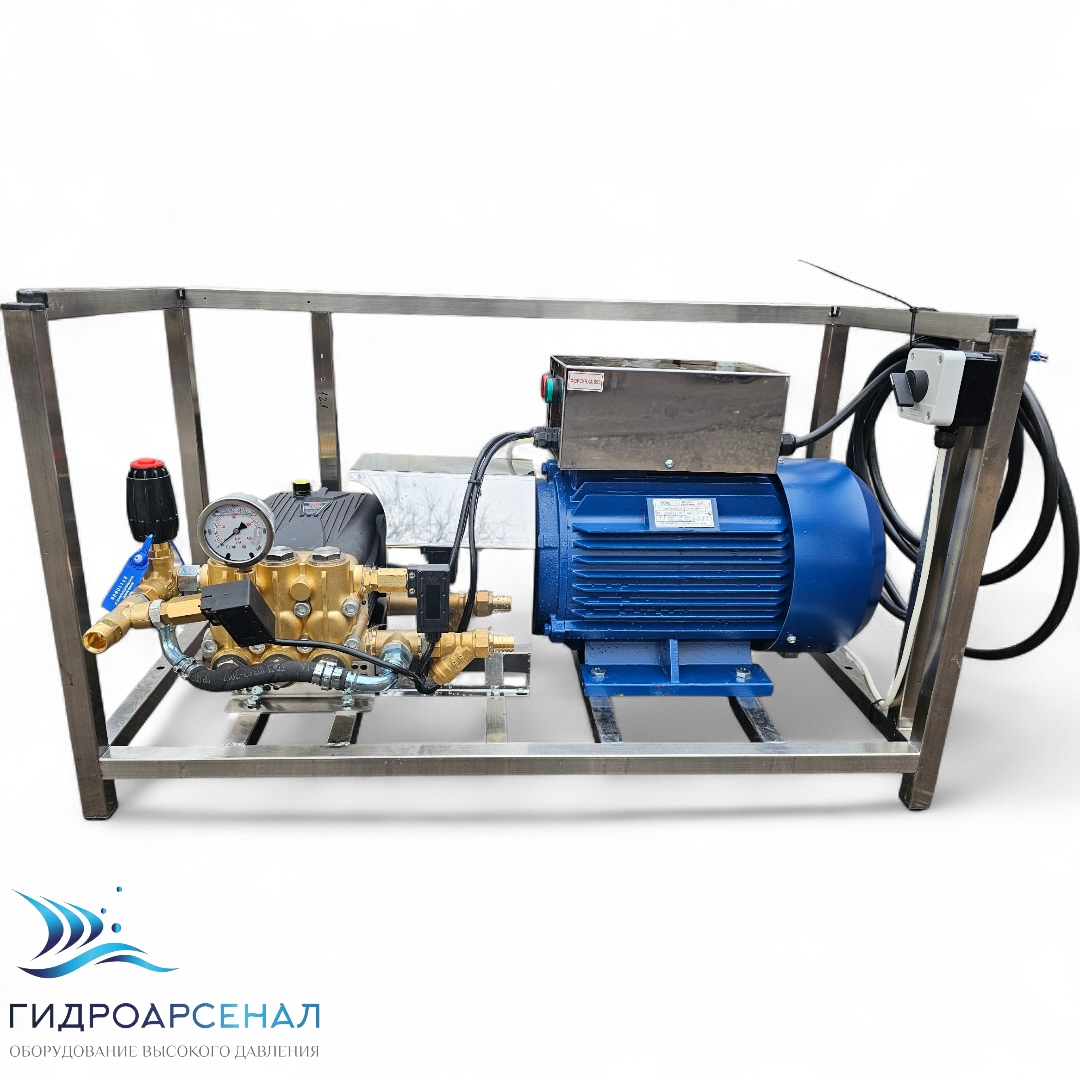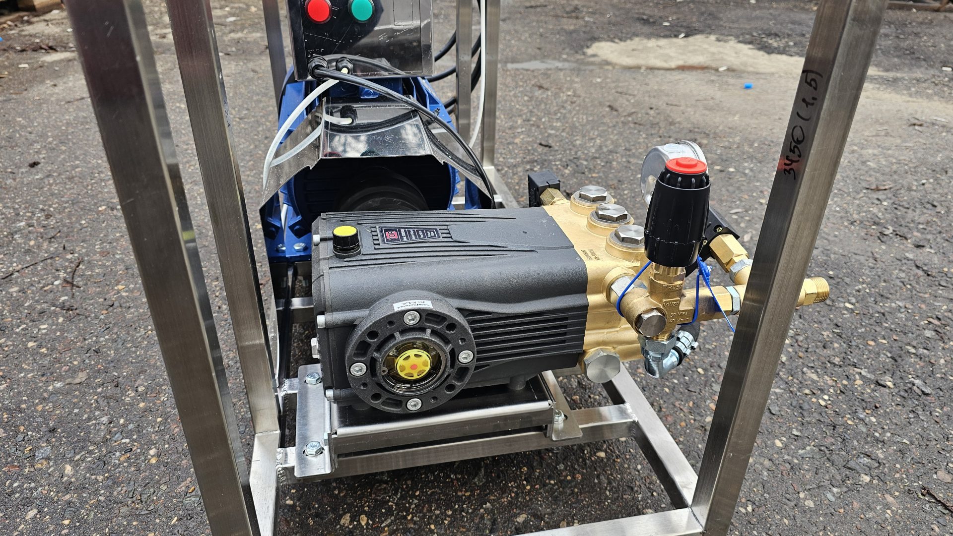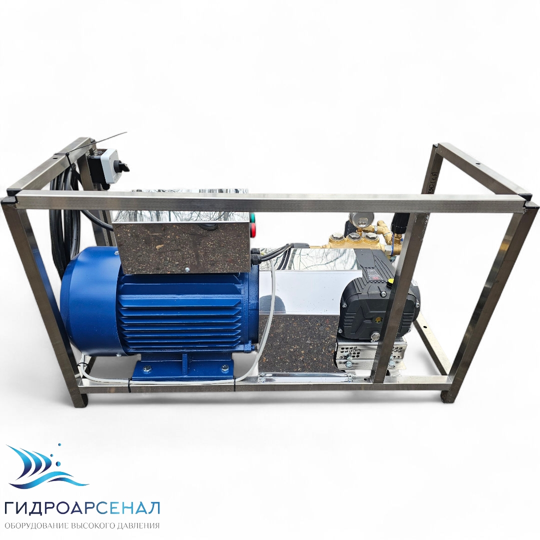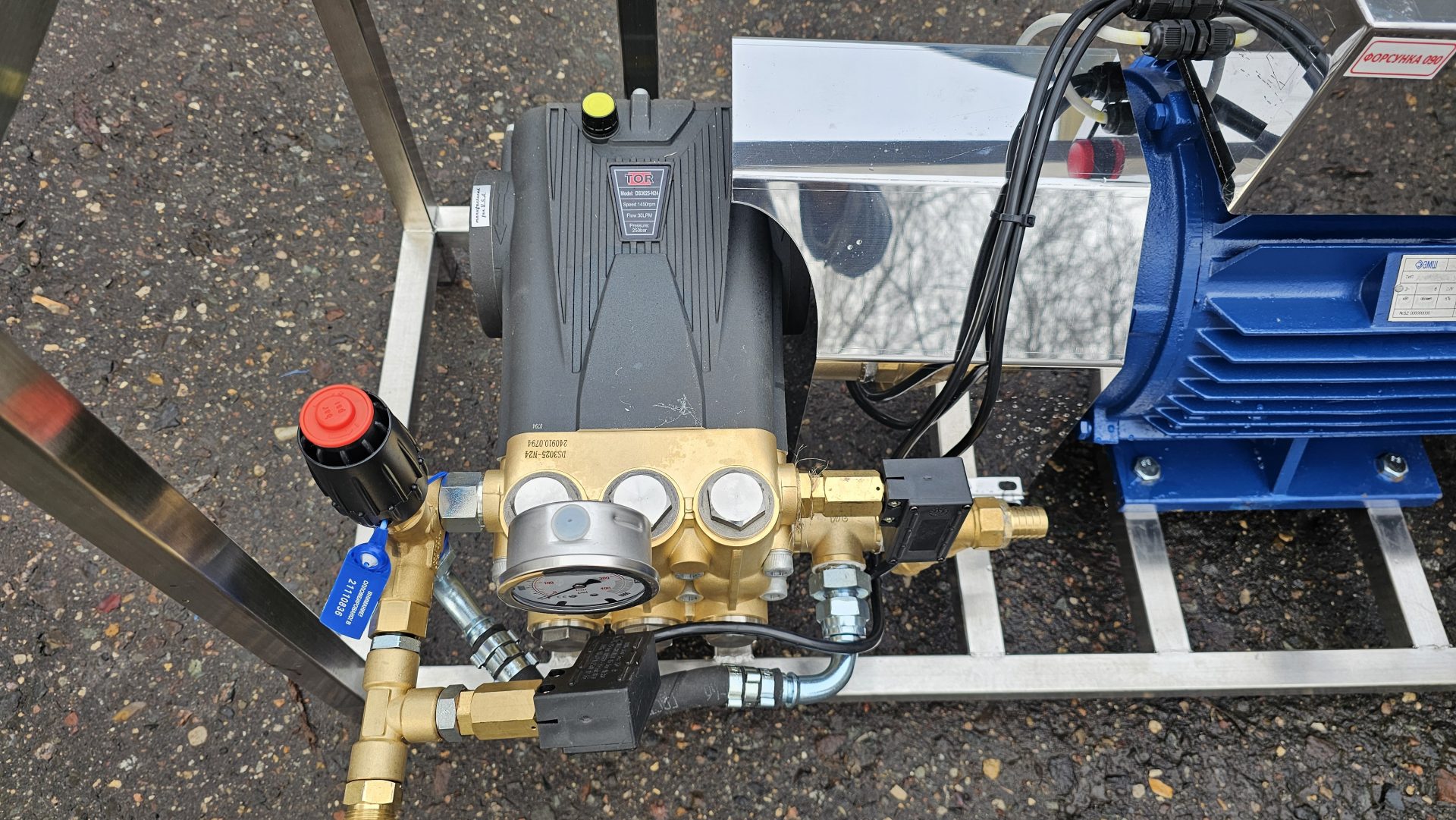 В АВД используется двойная защита электродвигателя от перегрузок и перегрева, что значительно повышает надежность АВД в целом. При этом, данный АВД рассчитан для работы с входящей температурой воды до 40 градусов Цельсия. Электродвигатель АИР132S4 11 кВт 1500 об.мин (Россия). Соединение между валом насоса и валом электродвигателя осуществляется через компенсационную (эластичную) муфту FRC110, что значительно смягчает пусковую нагрузку на подшипники помпы и электродвигателя, увеличивая их рабочий ресурс. Пыле-влогозащищенный выключатель обеспечивают максимальную защиту персонала при работе в помещениях с высокой влажностью. Лампочки индикации сети (красная) и включения АВД (зеленая) упрощают работу с аппаратом.
