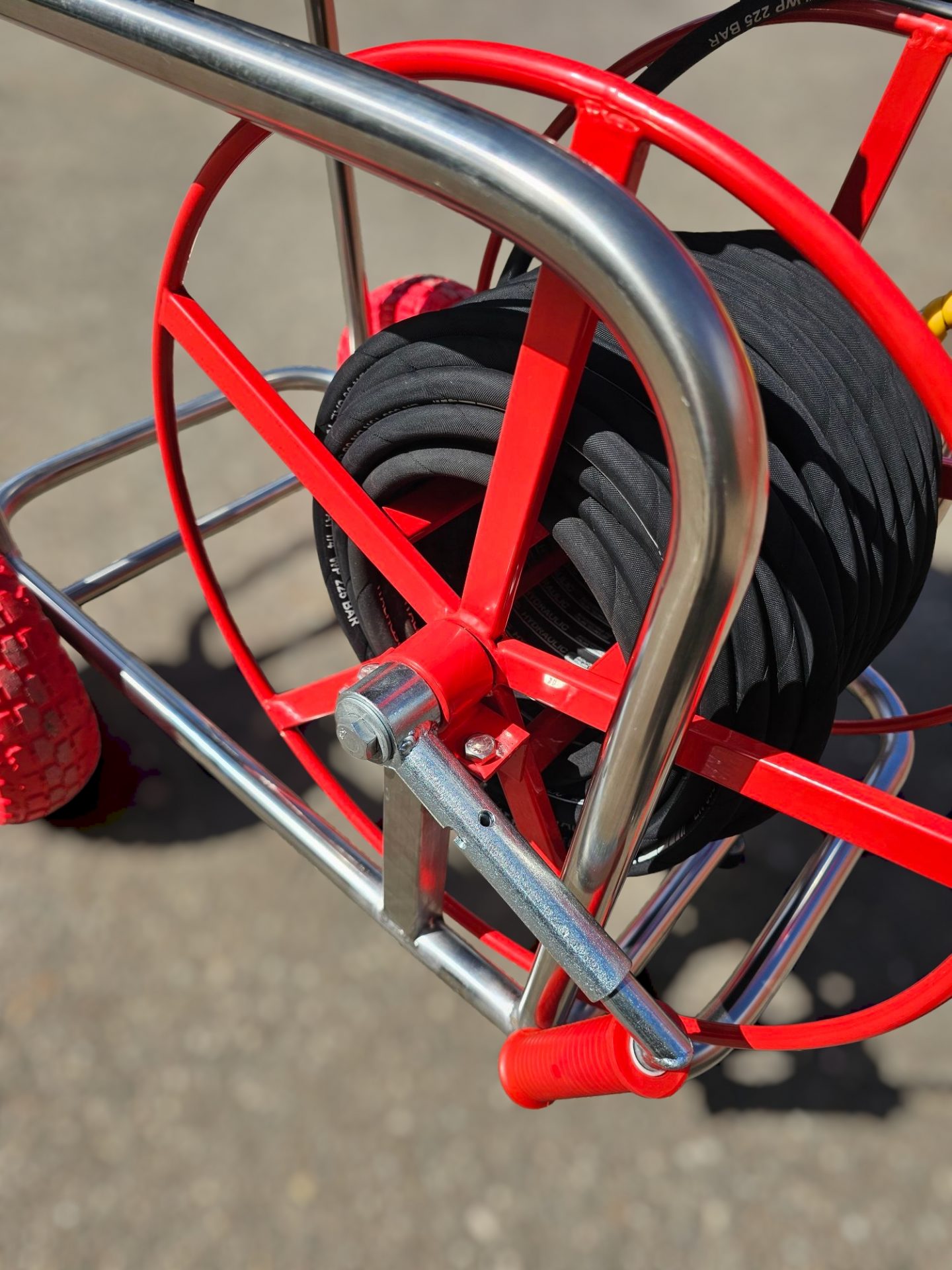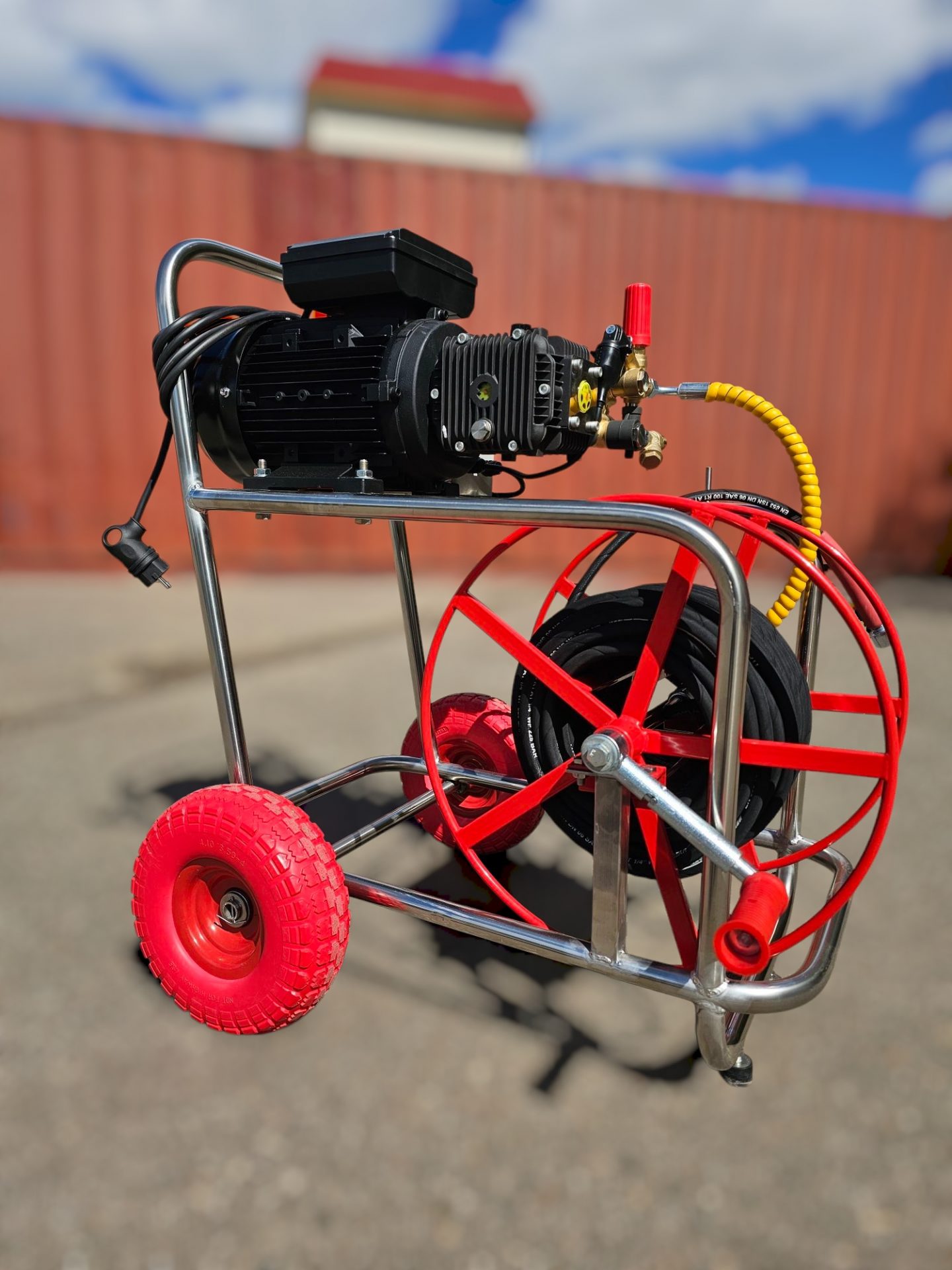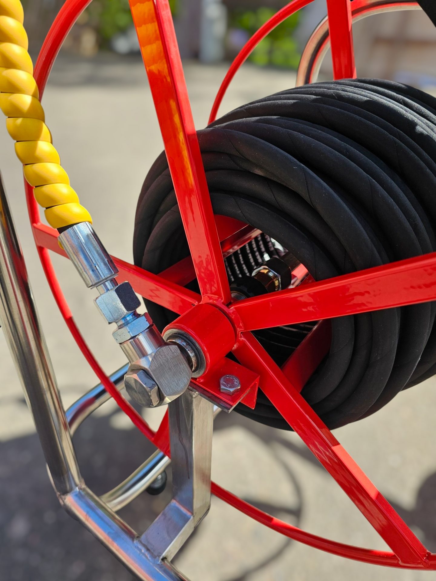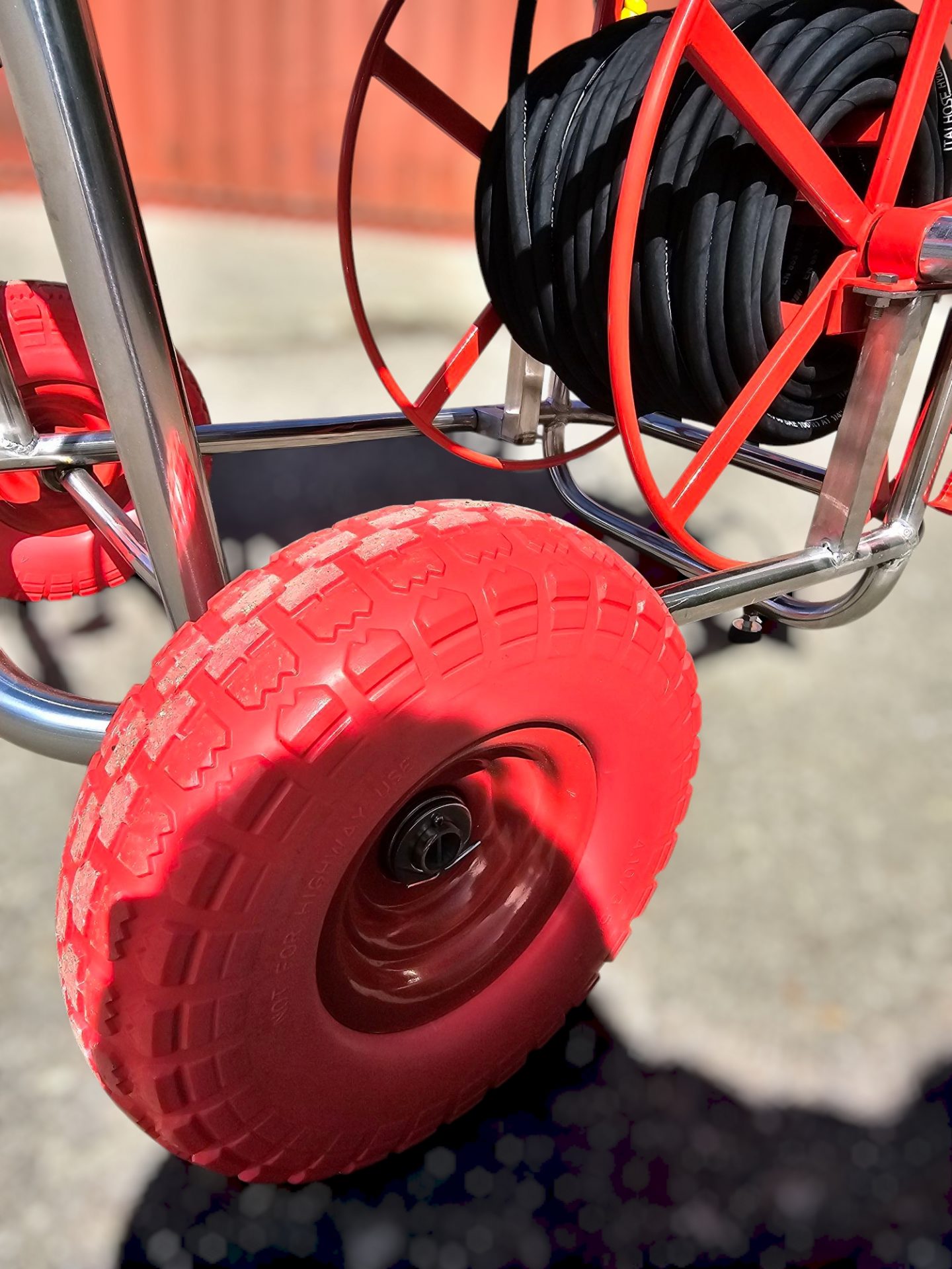Высокопрочная рама из нержавеющей стали со стальным барабаном на 50м РВД, обеспечивает надежность конструкции в сочетании с промышленными колесами D250.