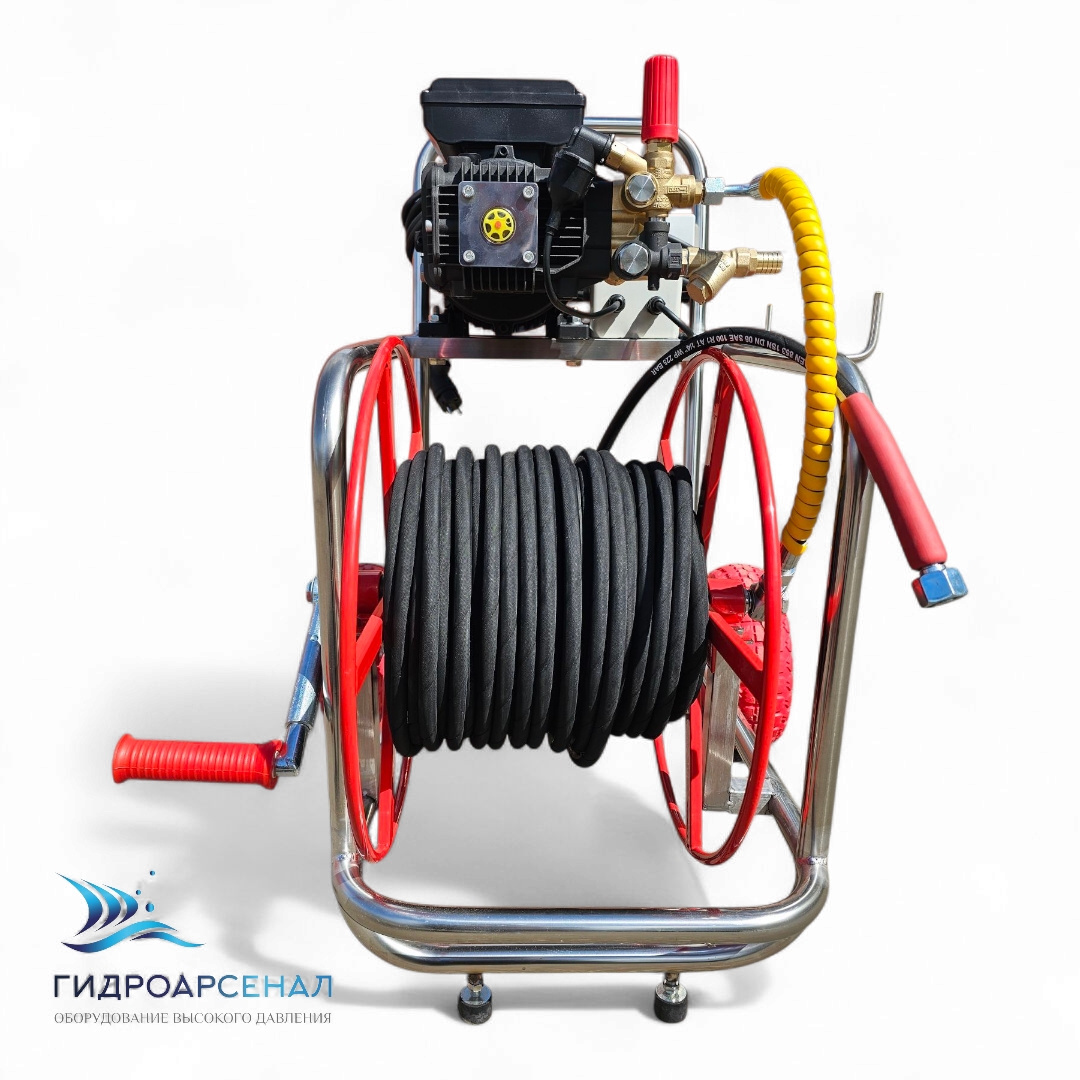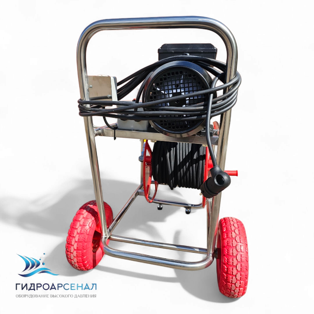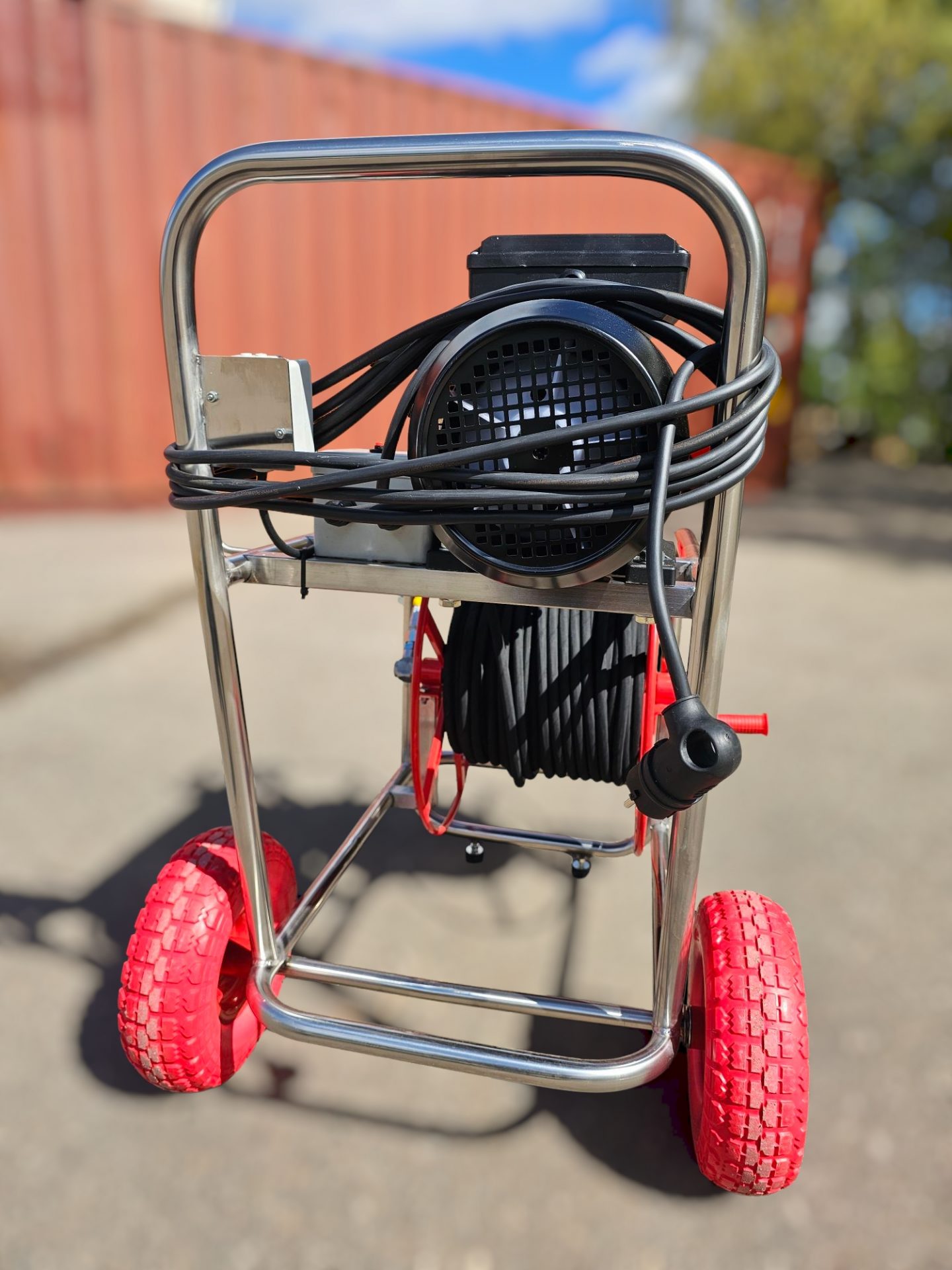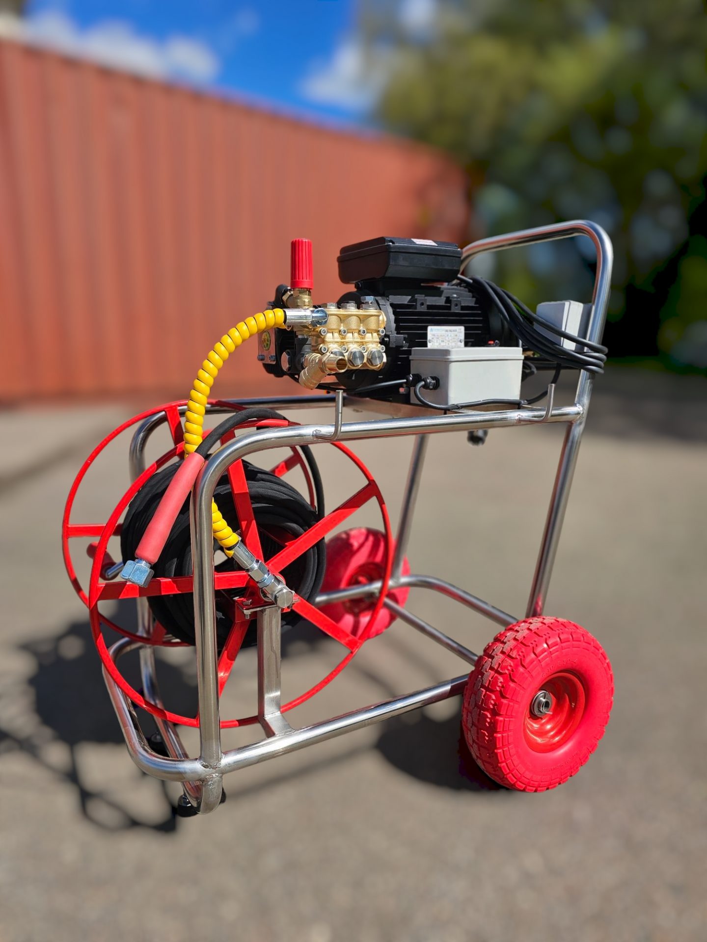 Высокопрочная рама из нержавеющей стали со стальным барабаном на 50м РВД, обеспечивает надежность конструкции в сочетании с промышленными колесами D250.