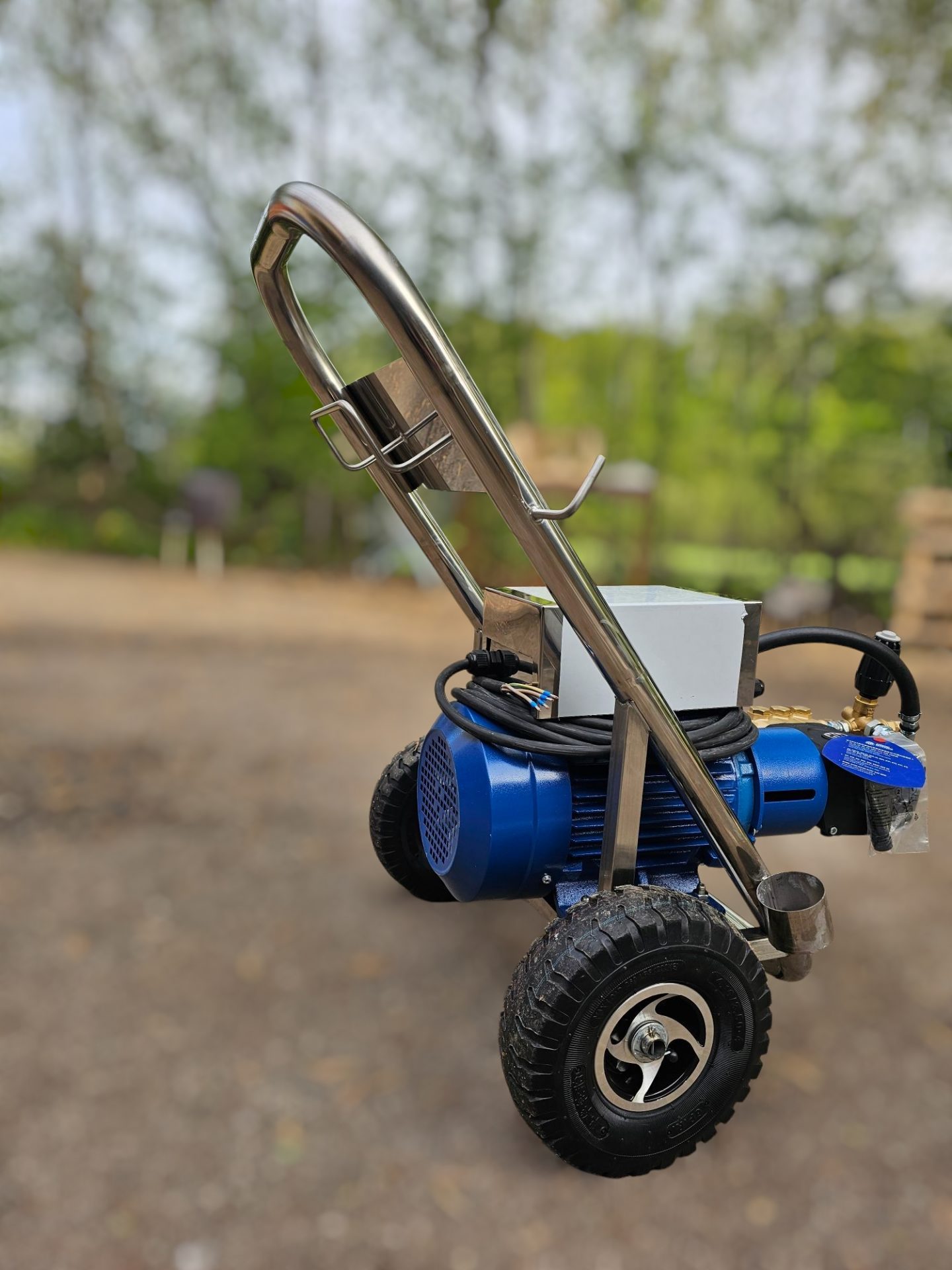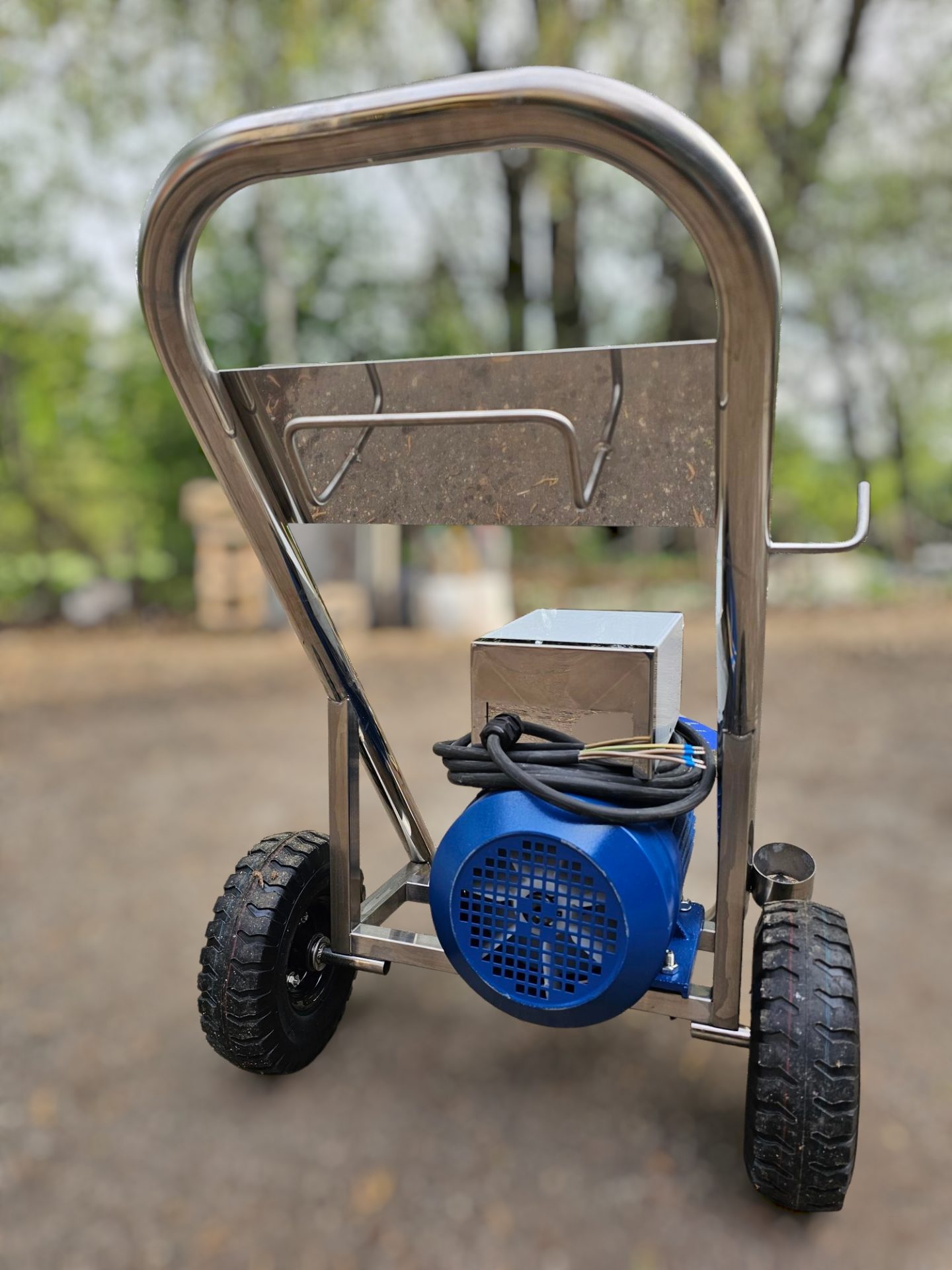 Высокопрочная стальная тележка из трубы D38 нержавеющей стали на полиуретановых (или пневматических) колесах D350 с подшипником скольжения обеспечивает надежность перемещения оборудования по любой поверхности и дальности.