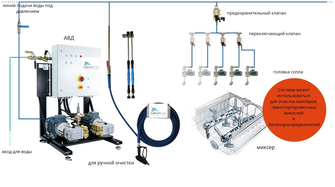 Автоматическая система очистки двухвальных бетоносмесителей представляет собой комплекс оборудования, предназначенный для быстрой периодической очистки миксеров от стойких отложений еще не затвердевшего бетона.