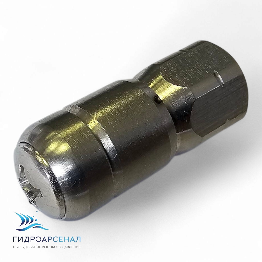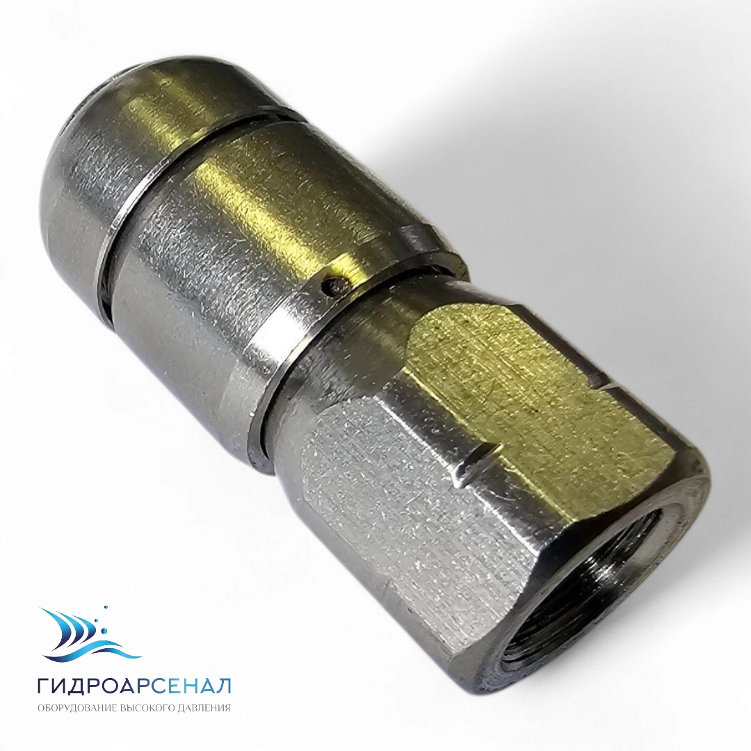 Фреза вращающаяся для очистки внутренней поверхности труб высоким давлением до 500 бар. Имеет 3 отверстия назад под углом 45 градусов, благодаря чему самостоятельно двигается вперед в трубе, размывая все отложения.