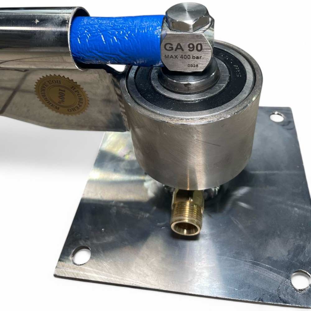Поворотная консоль предназначена для потолочного и реже настенного крепления. Благодаря двум поворотным фитингам, обеспечивается вращение консоли на 360 градусов, что значительно облегчает труд автомойщика и, соответственно, ускоряет процесс мойки автомобиля, а значит появляется возможность увеличить проходную способность автомойки и непосредственно прибыль. При этом, использование поворотной консоли предотвращает наезд автомобилем на шланг высокого давления, что значительно увеличит ресурс службы шланга. С использованием поворотных консолей на автомойке исчезает проблема повреждения ЛКП автомобиля перекрученными шлангами в. д. и пистолетом в процессе обслуживания клиентского авто.