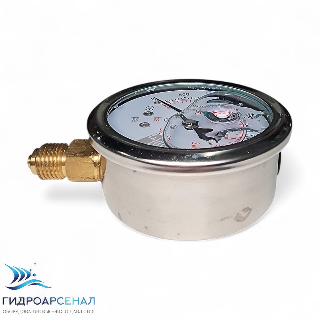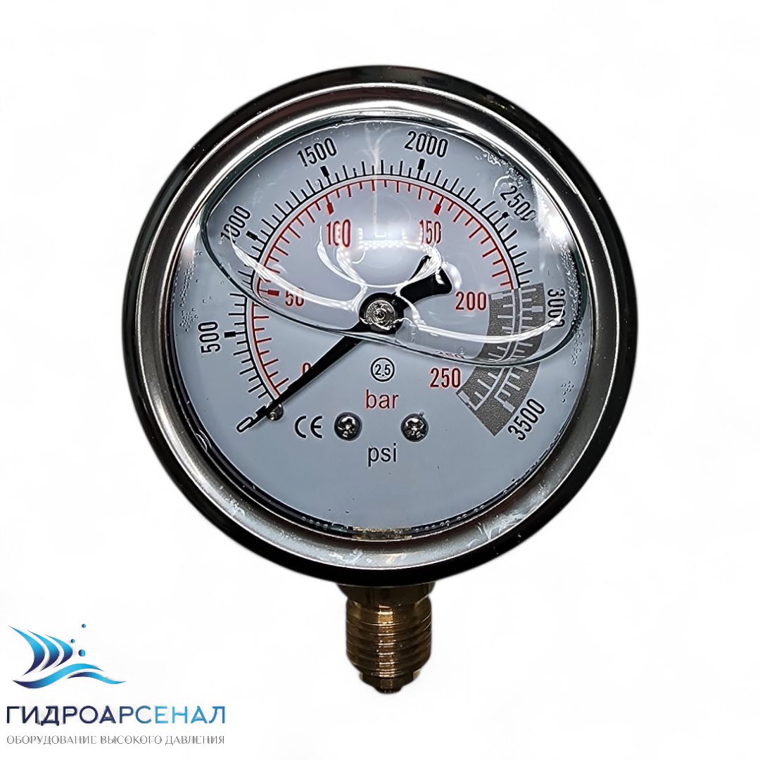 Заполнен глицерином для снижения вибрации и пульсации при работе АВД.