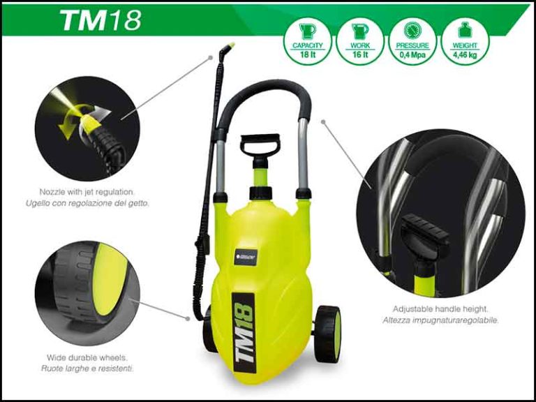 Мобильный ручной распылитель предназначен для профессионального использования и для работы в таких областях применения, как автомойка, опрыскивание, борьба с вредителями, Парниковая обработка, использование инсектицидов, фунгицидов, защита окружающей среды, больницы, школы, сельскохозяйственные и промышленные ангары. Идеально подходит для использования с продуктами для дезинфекции. Пластиковый бак имеет емкость 18 литров. Этот распылитель совместим со многими широко используемыми химическими веществами, кислотами и щелочными веществами. Безопасность и простота использования гарантированы.