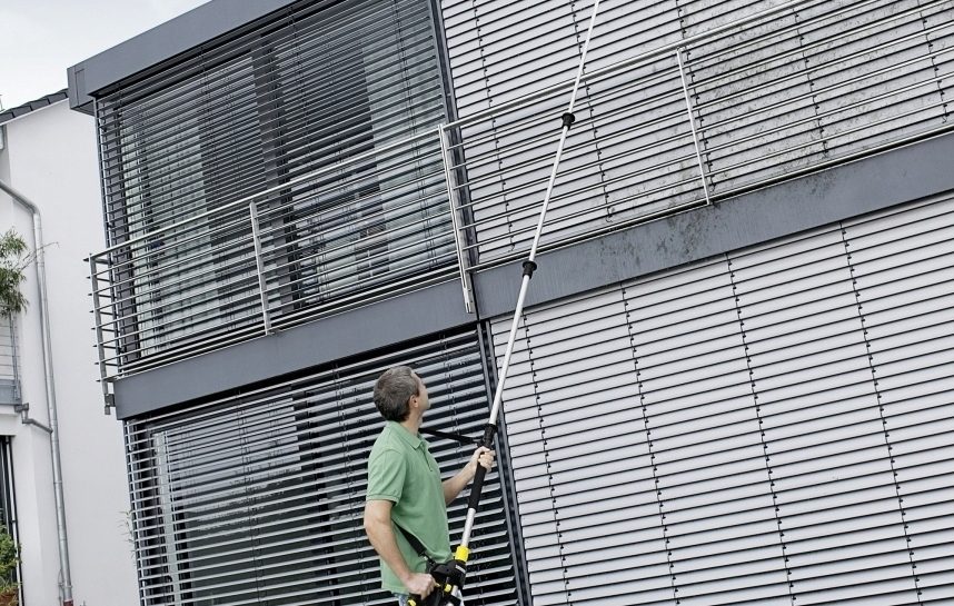 Мойка фасада при помощи аппарата высокого давления также производится с земли. Для такой мойки кроме стандартного комплекта: АВД, рукава (шланга) высокого давления, также понадобится специальное оборудование – телескопическое копье, которое сможет подать воду на 2 и 3 этаж.