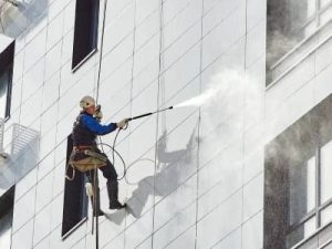 – При третьем варианте мойку осуществляют промышленные альпинисты. Обычно аппарат высокого давления размещают на крыше, работы проводятся от верхнего этажа к цоколю; промышленные альпинисты используют в работе длинный шланг с пистолетом и подходящей насадкой.