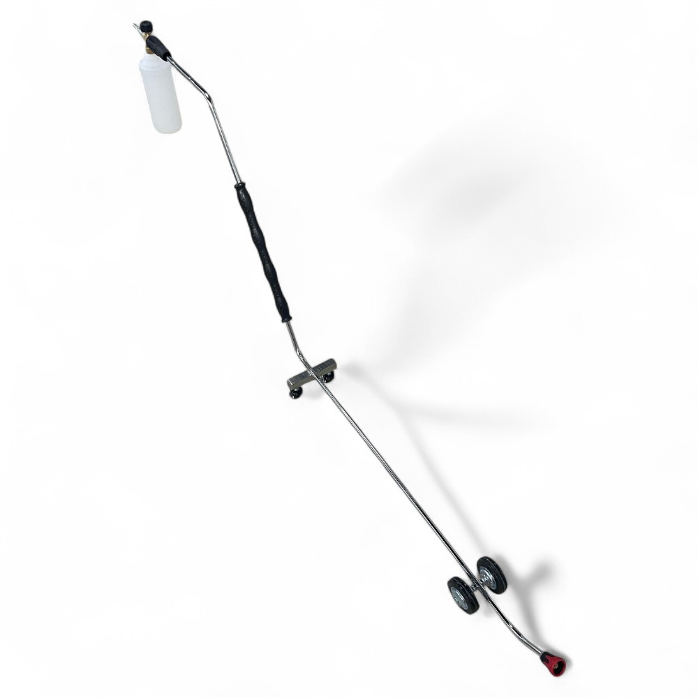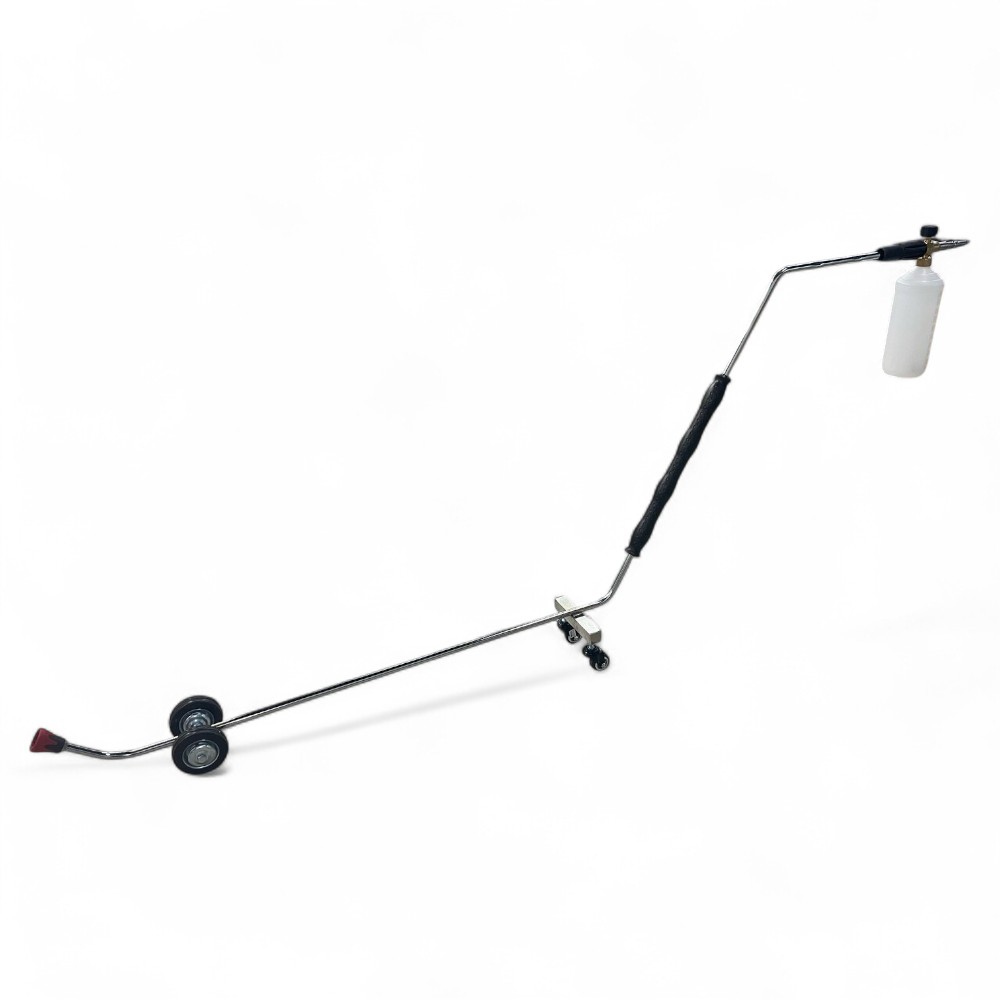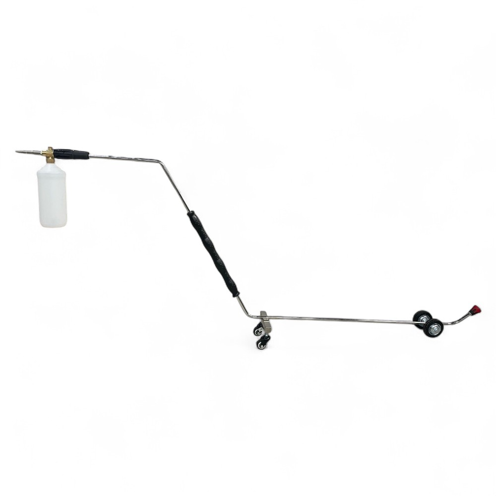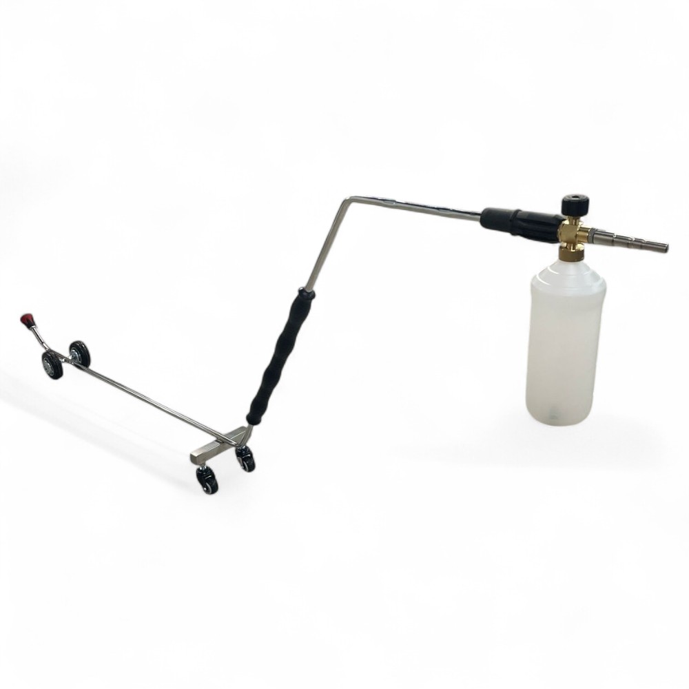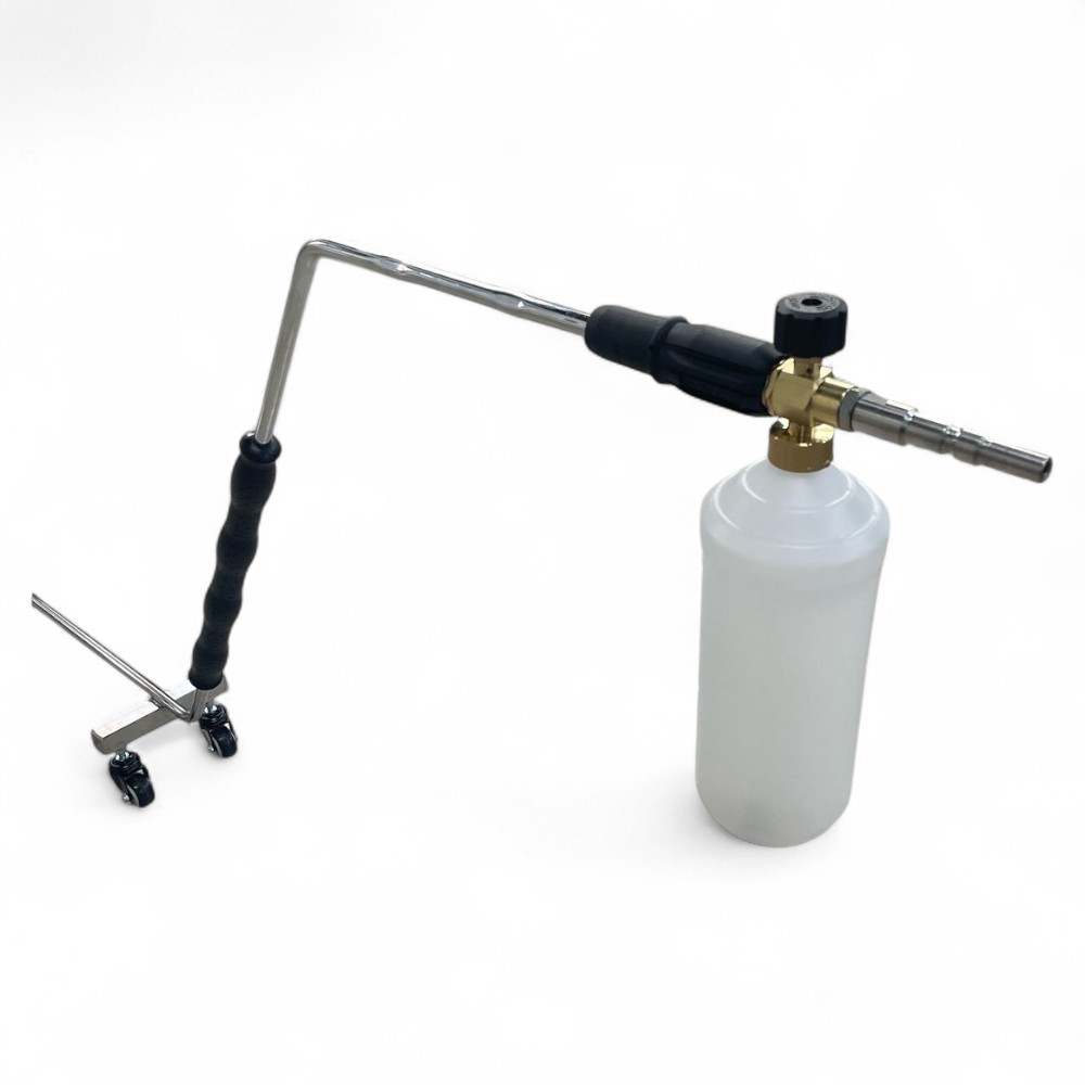 Наша насадка для мойки днища единственная из аналогов оснащена функцией пенообразования. Для этого в бутылку пенной насадки наливается необходимая химия и по отдельной трубке подается на днище автомобиля.