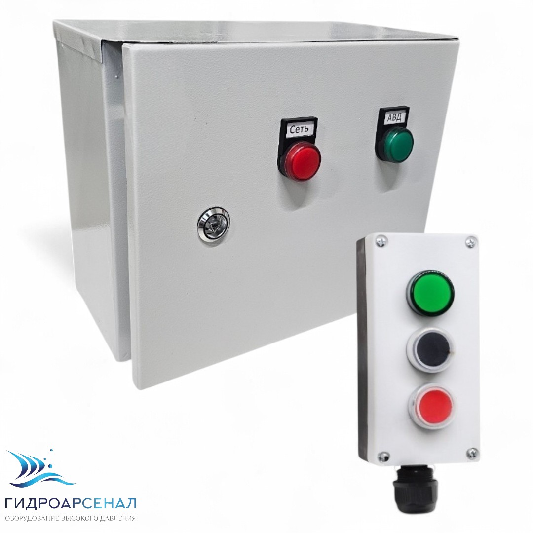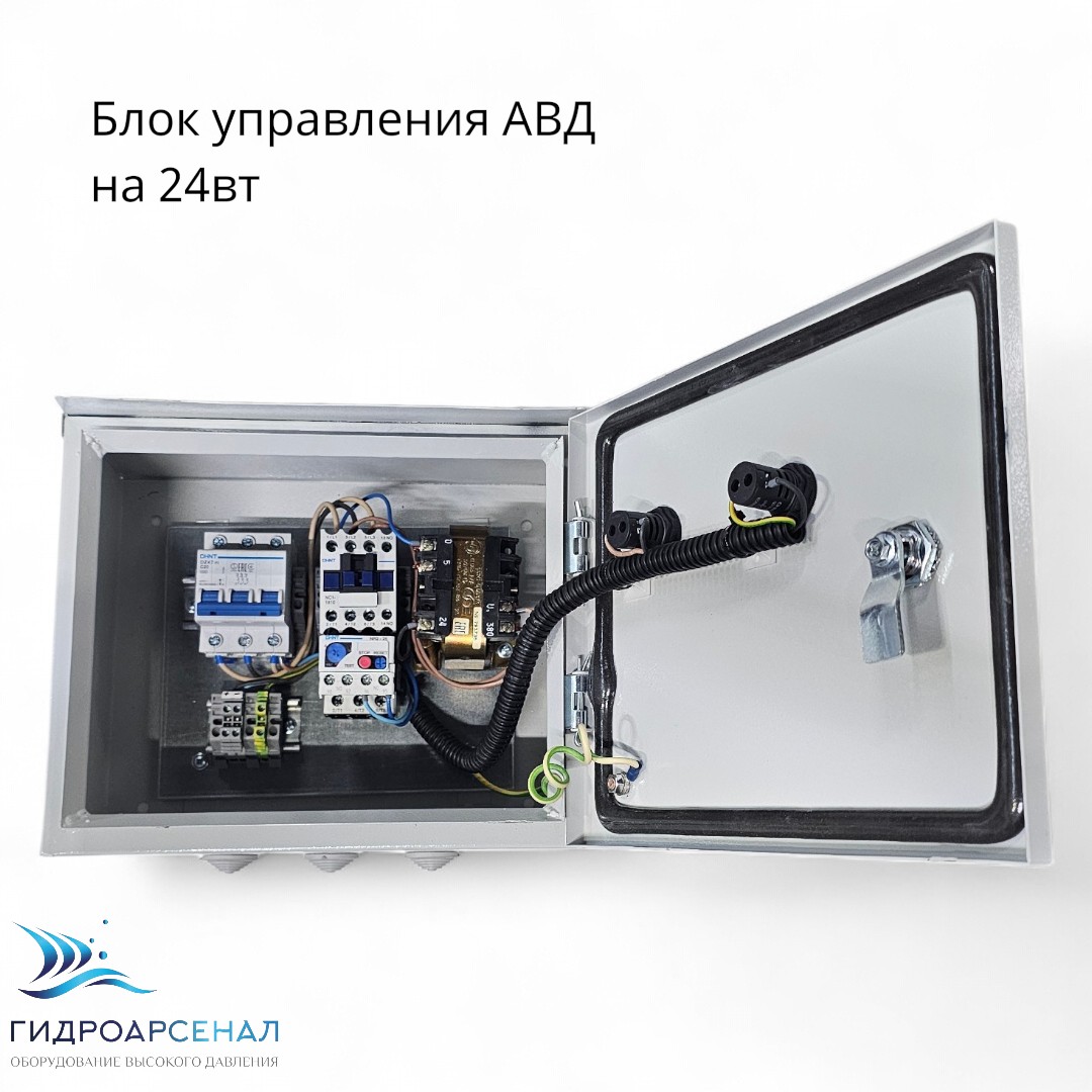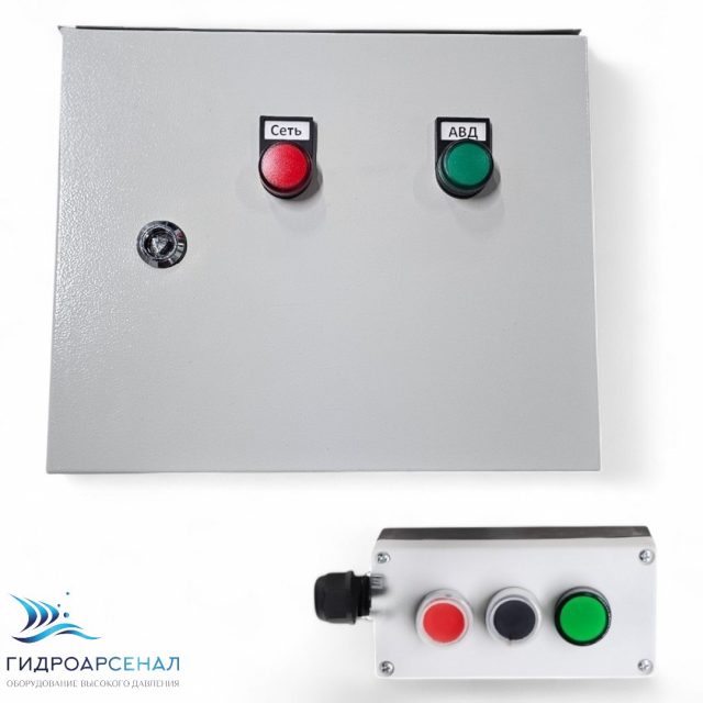 Отличительной особенностью этой комплектации является наличие трансформатора понижения напряжения с 380Вт на 24Вт, которое подается на выносной пост вкл/выкл АВД, отличное решение для соблюдения правил техники безопасности при работе во влажном помещении.