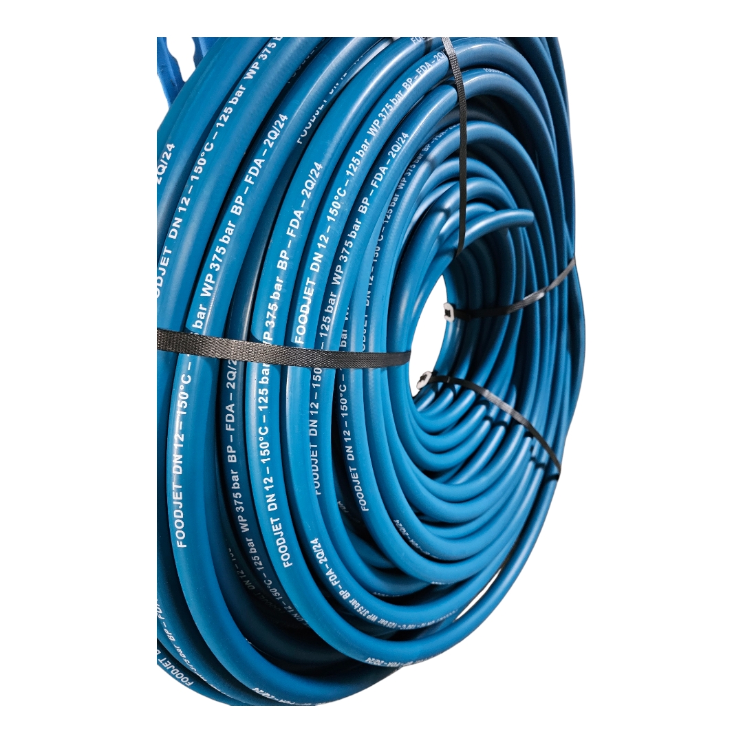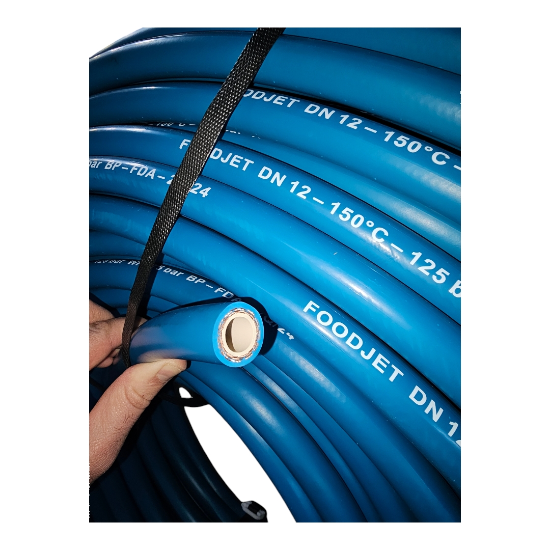 Шланг для пищевой промышленности Foodjet, изготовлен в соответствии с стандартом DIN EN 854. Особо стоек к животным и птичьим жирам. Наружная оболочка из синтетической резины. Внутренняя оболочка из синтетической маслоустойчивой резины. Две высокопрочные текстильные оплетки. Благодаря своим высокопрочным текстильным оплеткам и гладкой наружной поверхности из синтетической резины этот шланг ВД легок и безопасен в эксплуатации.