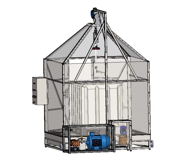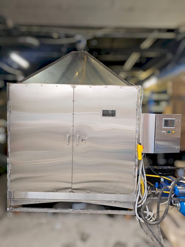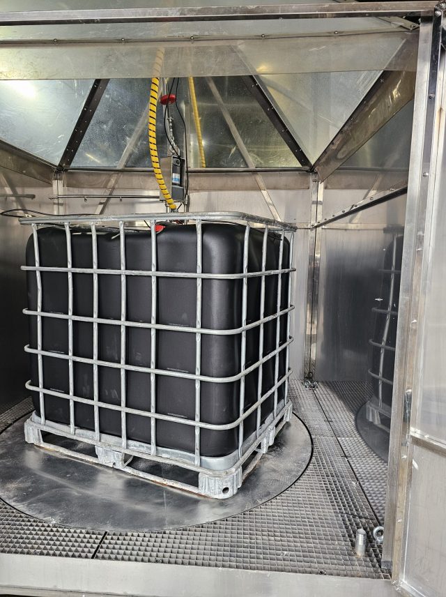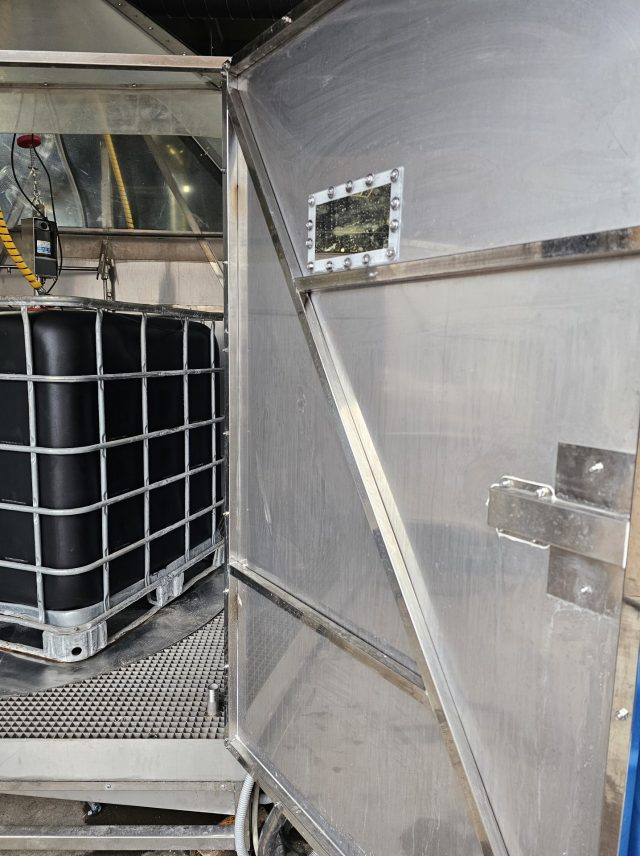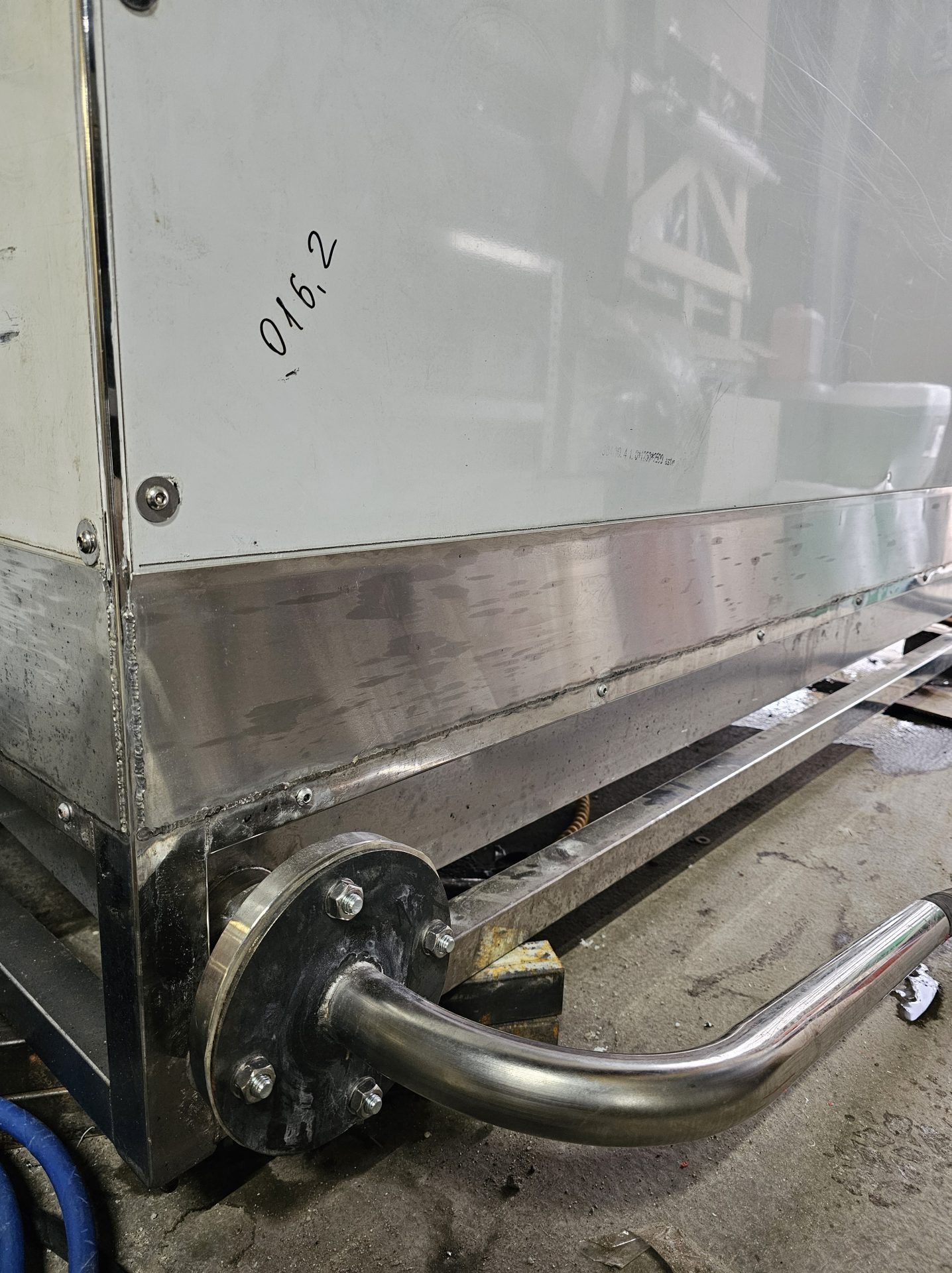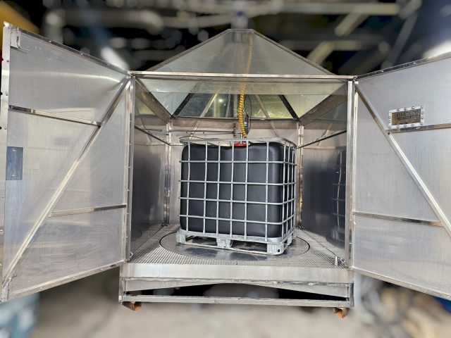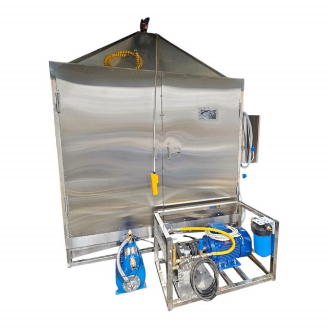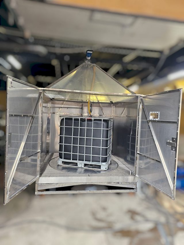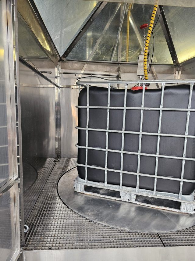 - Стенд для автоматич. мойки еврокубов. Материал нерж.сталь. Полностью закрыт от брызг и пара. Распашные ворота. Автоматический поворотный подиум. Сгоны 2шт для слива грязной воды.