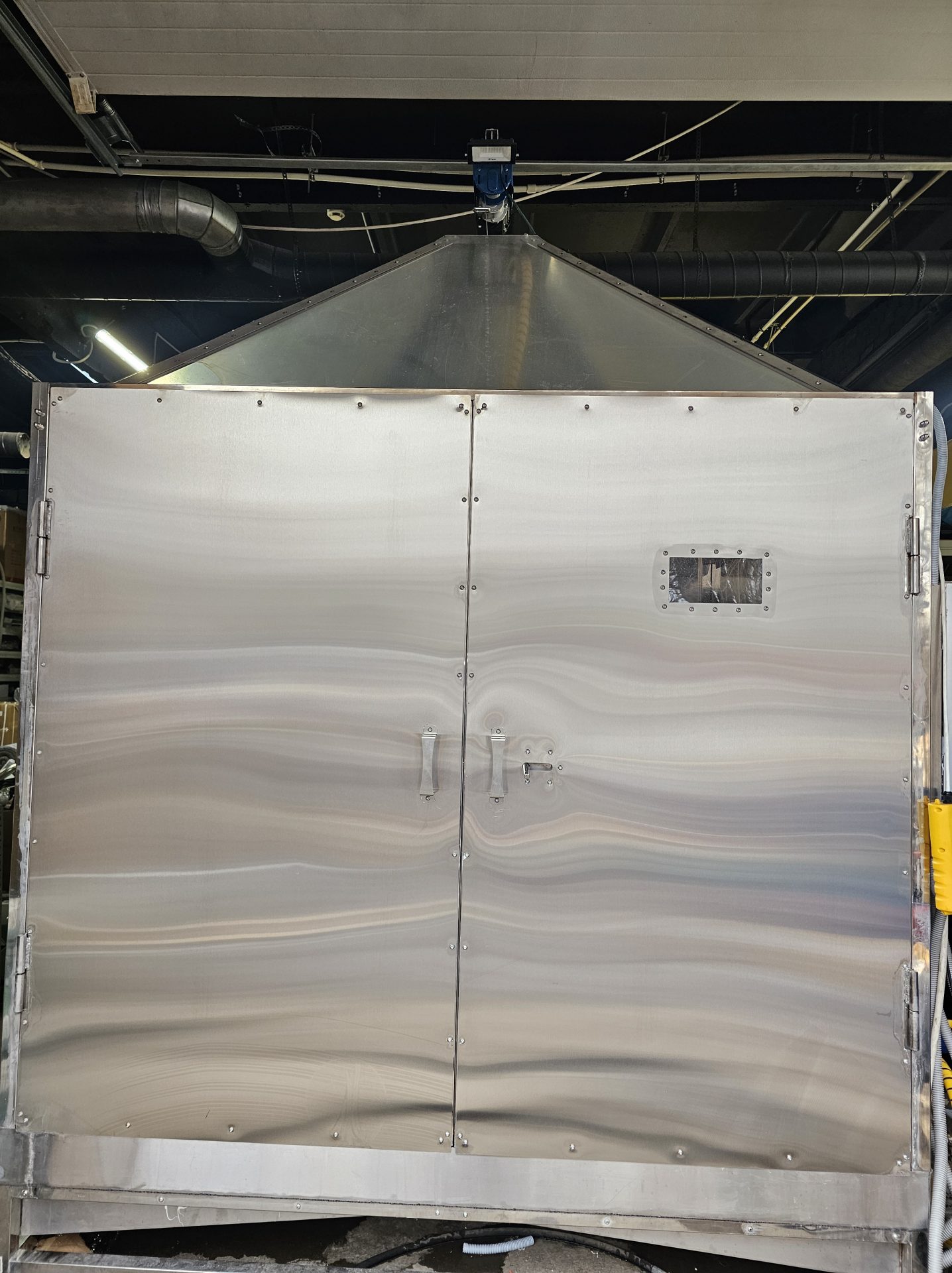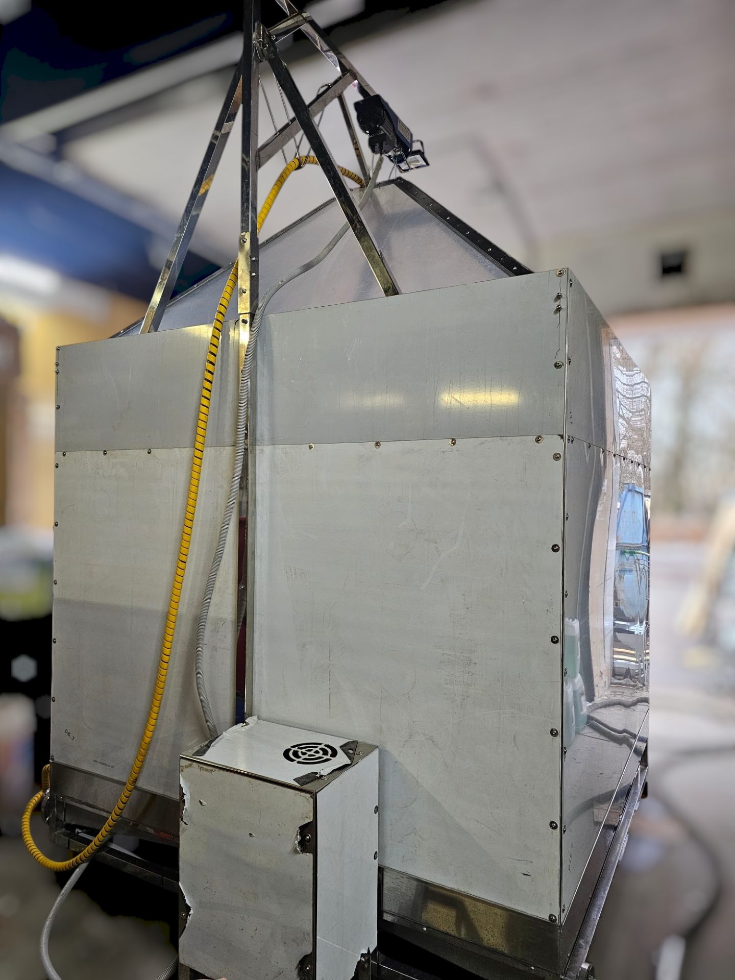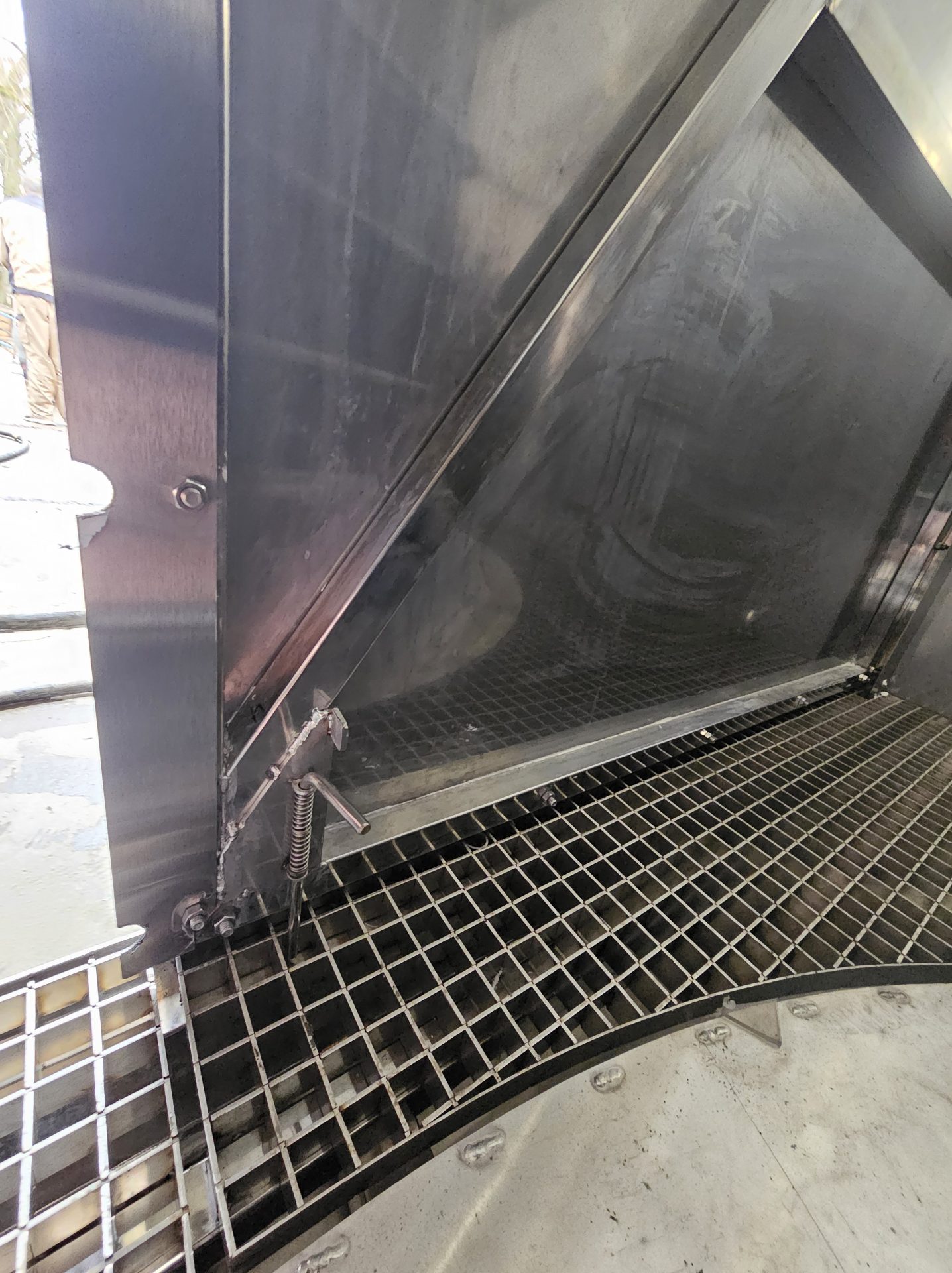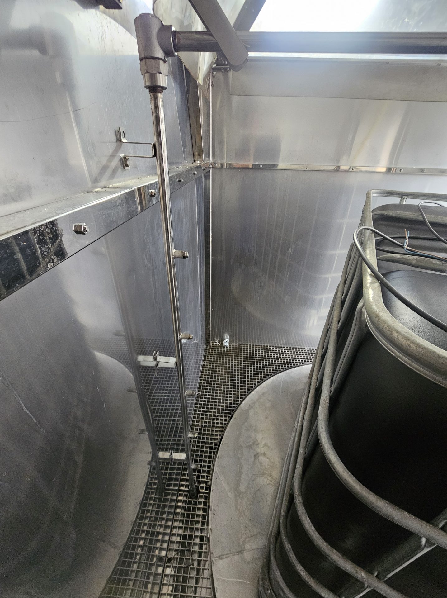 - Стенд для автоматич. мойки еврокубов. Материал нерж.сталь. Полностью закрыт от брызг и пара. Распашные ворота. Автоматический поворотный подиум. Сгоны 2шт для слива грязной воды.
