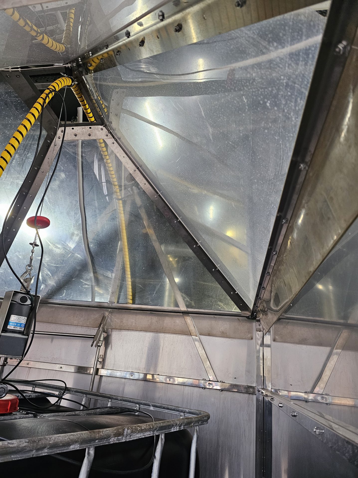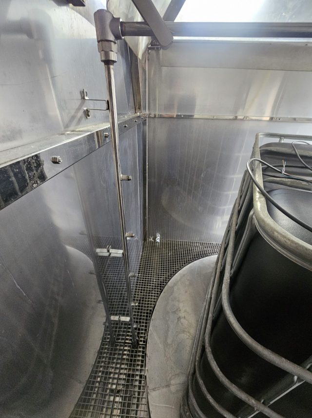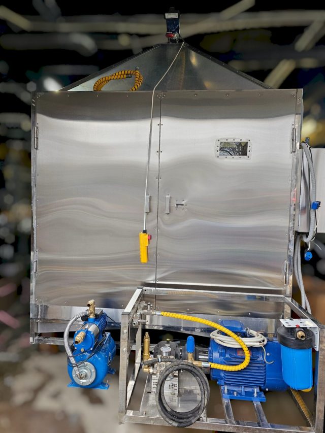 Функция наружной мойки осуществляется при помощи Г-образного форсуночного коллектора высокого давления, через который воды вод давлением промывает поверхность емкости сбоку и с верху. При этом, емкость вращается на поворотном столе со скоростью 8 оборотов в минуту. Время этого цикла возможно программировать в зависимости от степени и стойкости загрязнения. При необходимости, возможно автоматическое программное нанесения моющих или дезинфицирующих средств на поверхность емкости с последующим смывом чистой водой. Процесс наружной мойки емкости проходит в полностью закрытом от брызг и выхода пара стенде. Сверху стенд закрыт поликарбонатными прозрачными листами, для доступа внутрь естественного освещения. При запуске процесса наружной или внутренней мойки, включается подсветка, которая позволяет при необходимости контролировать визуально процесс мойки и финальный результат.