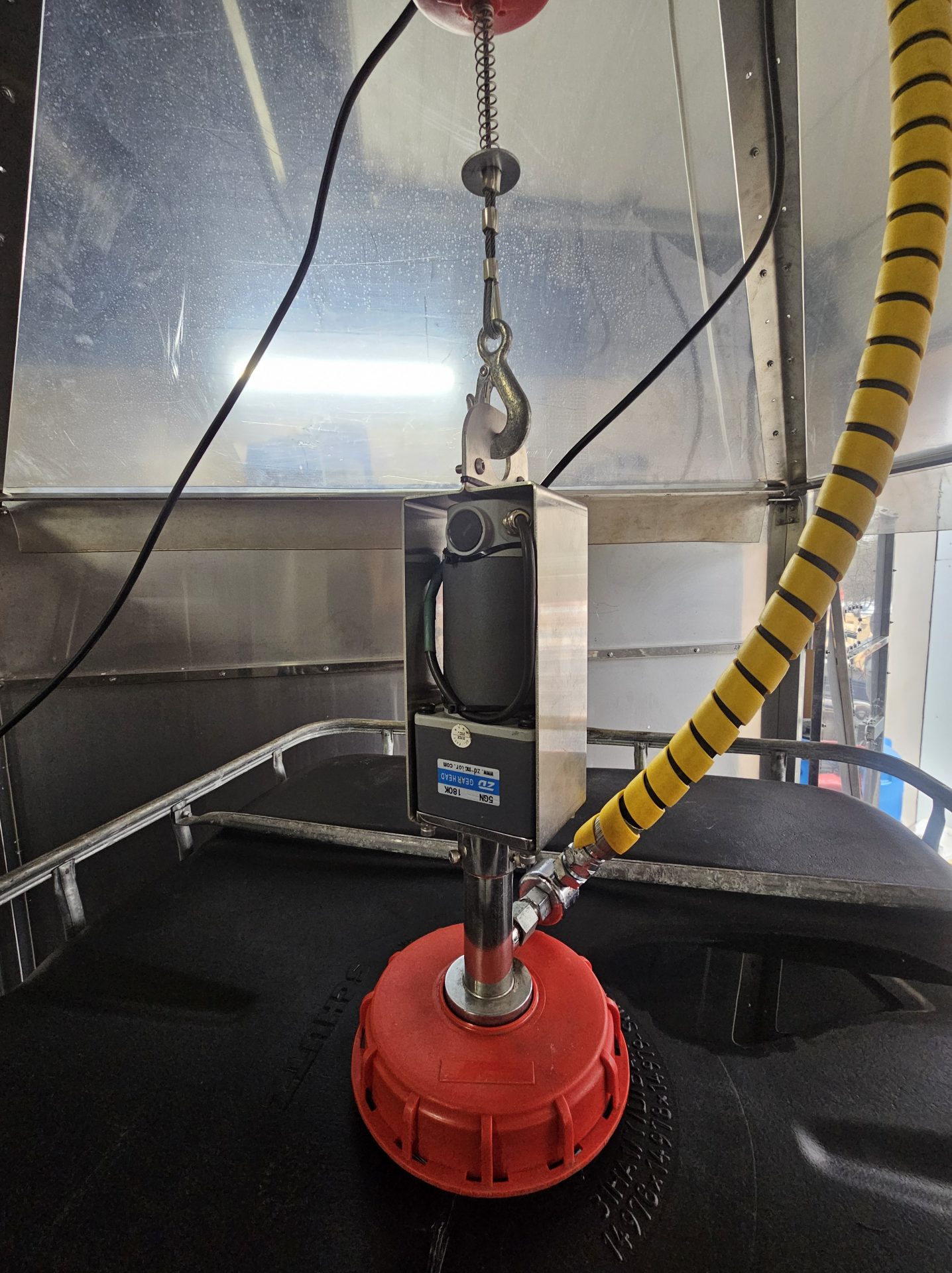 Функция внутренней мойки емкости проводится РОТОРНОЙ МАШИНОЙ ДЛЯ ОЧИСТКИ ЕМКОСТЕЙ С МОТОРНЫМ ПРИВОДОМ IBC 3D. Головка вращается 360 градусов благодаря электродвигателю 24Вт, промывая все вокруг себя буквально за 5-7 минут. Головка подвешена к электрической мини-лебедке по центру подиума. При необходимости, оператор с пульта управления лебедкой опускает головку в емкость, фиксирует ее с помощью крышки и можно запускать процесс внутренней мойки. При работающей функции “мойка внутри” поворотный стол не вращается.